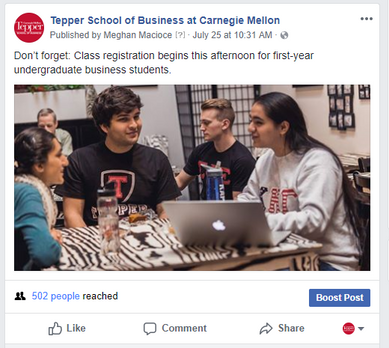 I interned with Carnegie Mellon University's Tepper of School Business during the summer of 2018 as the Social Media Intern. In this role, I posted on Tepper's social media platforms (Twitter, Instagram, Facebook, LinkedIn), created an entire social media campaign for the Tepper Quad, analyzed trends, and engagement of social media posts.
